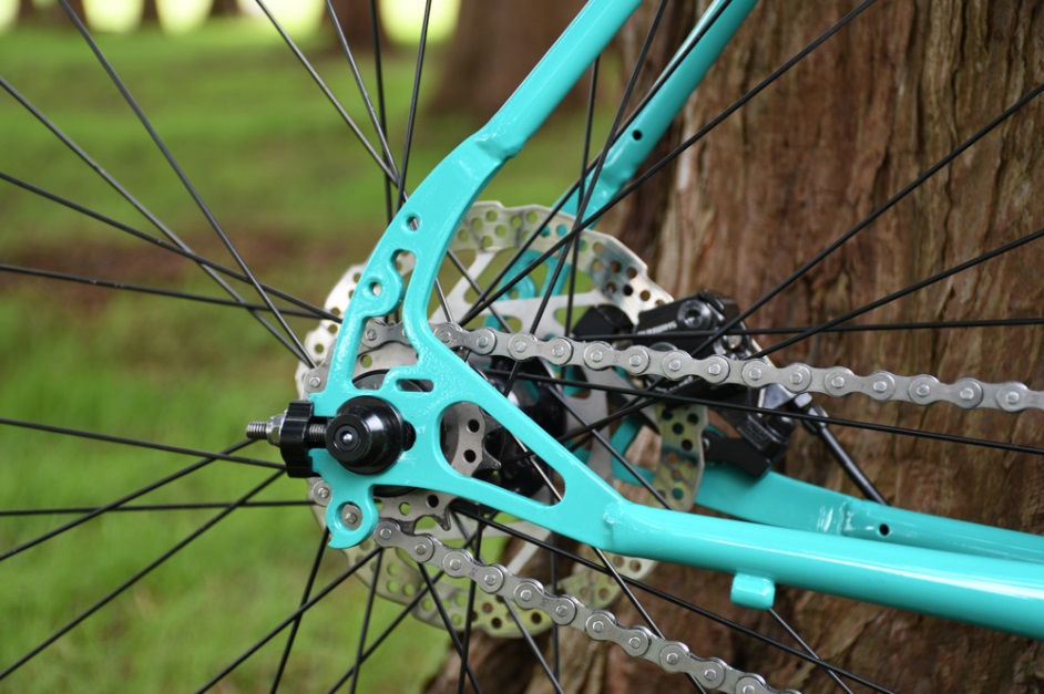 通常のドロップエンドではなく、正爪トラックエンドの採用につき、シングルスピード使用時におけるチェーンの前後たるみ調整はもちろん、リアセンター;420~438mmとホイールベースの変更により乗り味の変化を楽しむ事も可能。