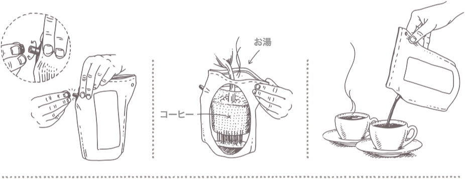 簡単に説明すると、フィルターが内蔵された袋の中に挽かれたコーヒー豆が入っており、口からお湯を注いで2~6分待機すればOK。