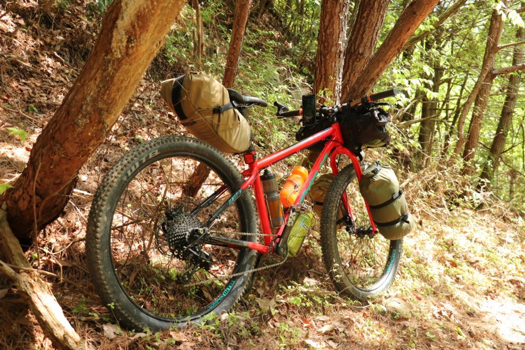 RADARのフレームにはダウンチューブ下にもボトル台座が用意されておりますので、今回のような水の補給場のないテン場でも安心。普段より多くの水の運搬積載が可能。(上の画像で3ℓ強あります)