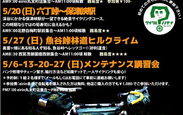 ★★eirin丸太町店&サイクルハテナ主催★★ 【日曜サイクリング】2018年5月の予定 & メンテナンス講習会”の 御案内です!