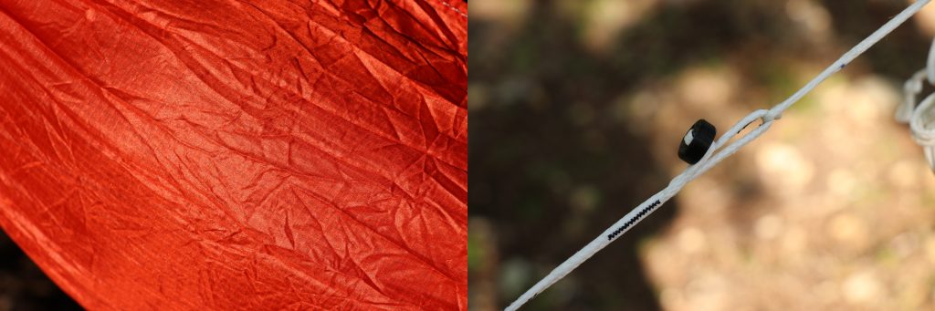パラシュート地のハンモックというのはよく聞きますがほとんどの場合は昔のハンモックと同じ生地、Hummingbirdでは文字通り現役でパラシュートに使われる生地を使用した本当の意味でのパラシュート地なんです。