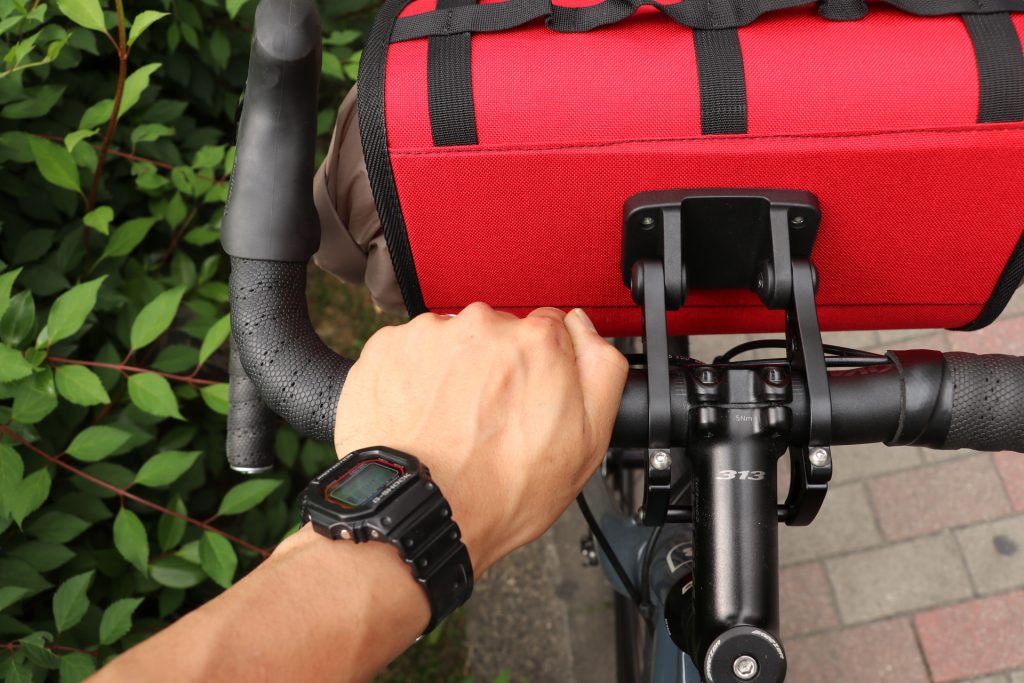 同ブランドTakeout Basketでも採用されたハンドル部で固定、ステムで支える”コンパクトなアルミ製ブラケット(ステム40mmでは取付不可)”で、軽量な作りながらも、荷物を乗せた際におこるあの”ユサユサ感”を一挙解決してくれております。