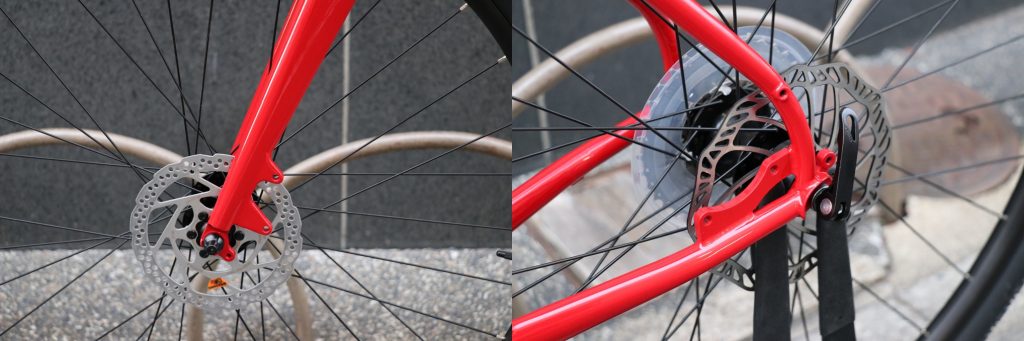 雨天時でも制動力が下がりにくいディスクブレーキ台座の規格は最もスタンダードなインターナショナルスタンダード、標準で160mmローターに対応しております。