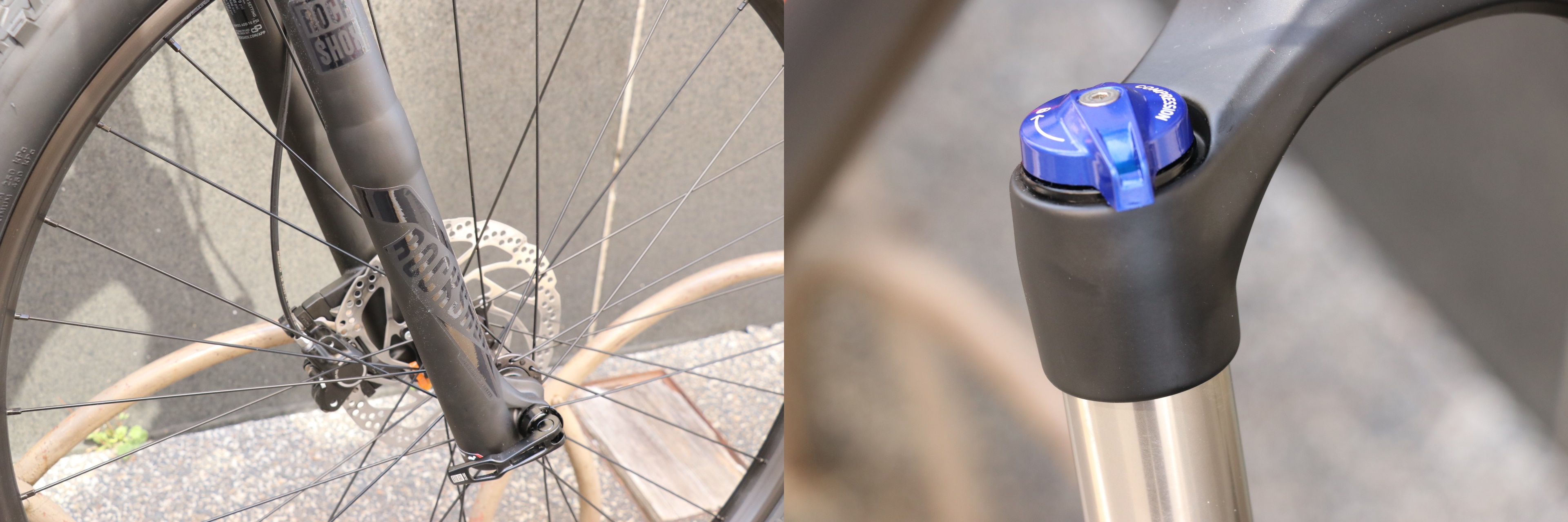 フロントサスペンションのROCK SHOX RECON も非常に丁度良いバランス。もちろん、もっと軽量だったり高機能な物はありますが10万円台前半で考えるとトレイルでも不便なく使えるラインを頑張ってくれていると思いますよ!