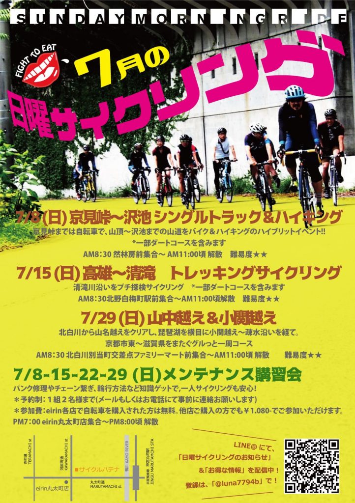 ★★eirin丸太町店&サイクルハテナ主催★★ 【日曜サイクリング】の2018年7月の予定 & メンテナンス講習会”の 御案内です!
