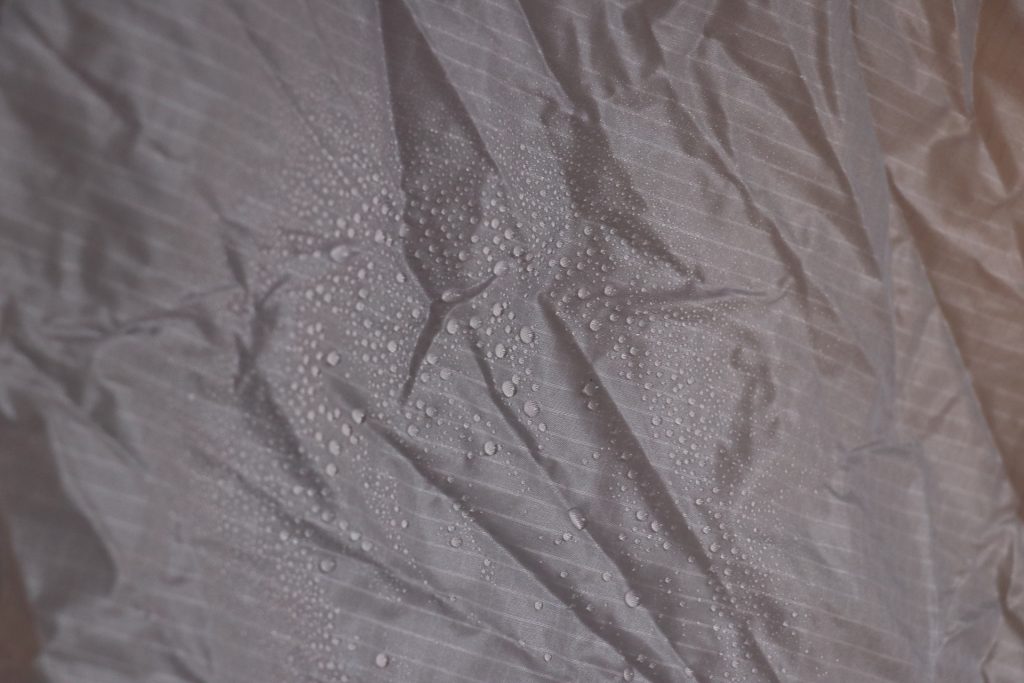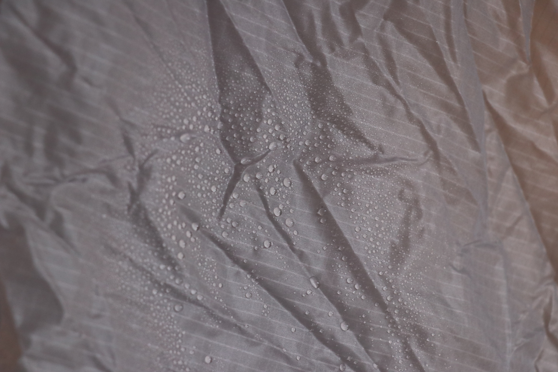 シルナイロンという樹脂コーティングされた生地は水を吸う事が無く、どんなに濡れても叩いてあげるだけで即乾燥。経験ある方もおられるでしょうが、自転車でもハイクでも濡れたレインウェアで行動するのはなかなかハード。それだけに防水+速乾というのはかなり重宝しますよ~