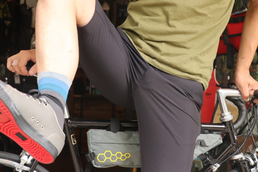 アクティブなボトムスには割と使われることの多い『4WAYクロス』、伸縮性は自転車で使う上でも文句の無い高いレベルを持ちながらも『東レPrimeFlex』よりも少し厚く、履いた感じも生地にコシがあるのでよりタフに使える仕様になりました~