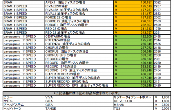 フレームセットから組み立ててみよう! ”各コンポーネント(シマノ・スラム・カンパ)”で完成車にする際の価格&重量をまとめてみましたの巻