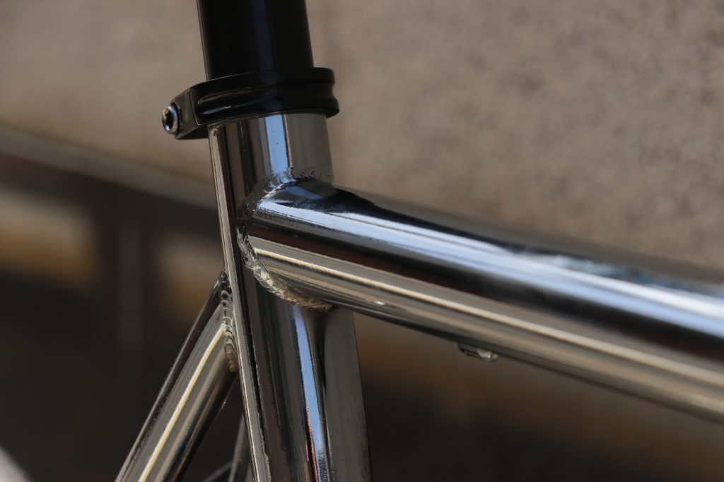 細いシャープなパイプで形成される美しいクロモリフレーム&フロントフォーク。路面からの衝撃吸収性高く、ロングライドにおける疲労軽減効果も高くあります。