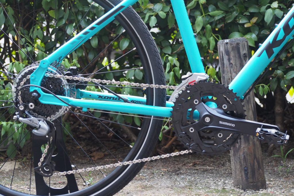 ギア周りは高品質でスムーズな操作性「Shimano Acera 3×9スピード」コンポ。街乗り~サイクリング、長距離ツーリングにも対応する実にスポーツバイクのスタンダードなギア比となっております。