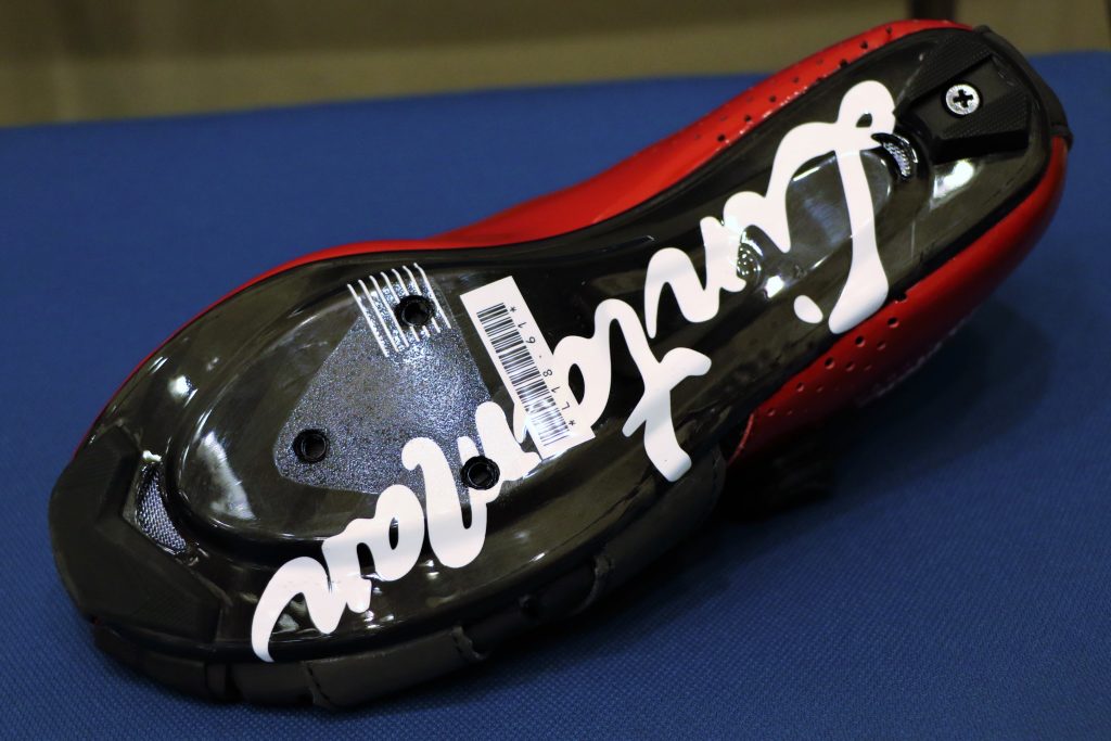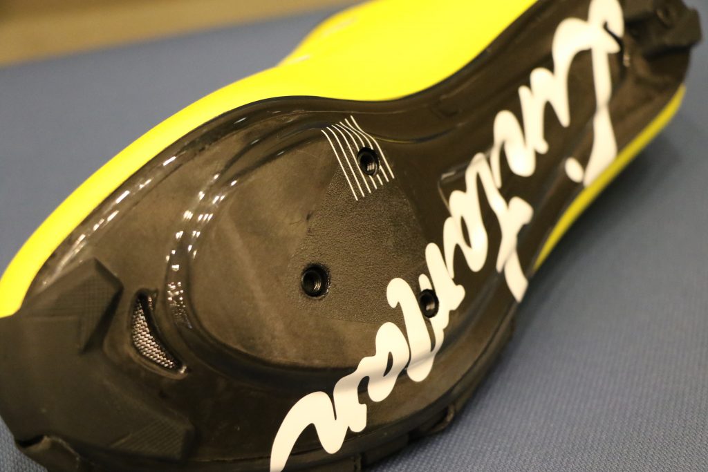 大きくブランドロゴが配された100%カーボンファイバーの高剛性ソールはもちろん軽量な仕上がり。