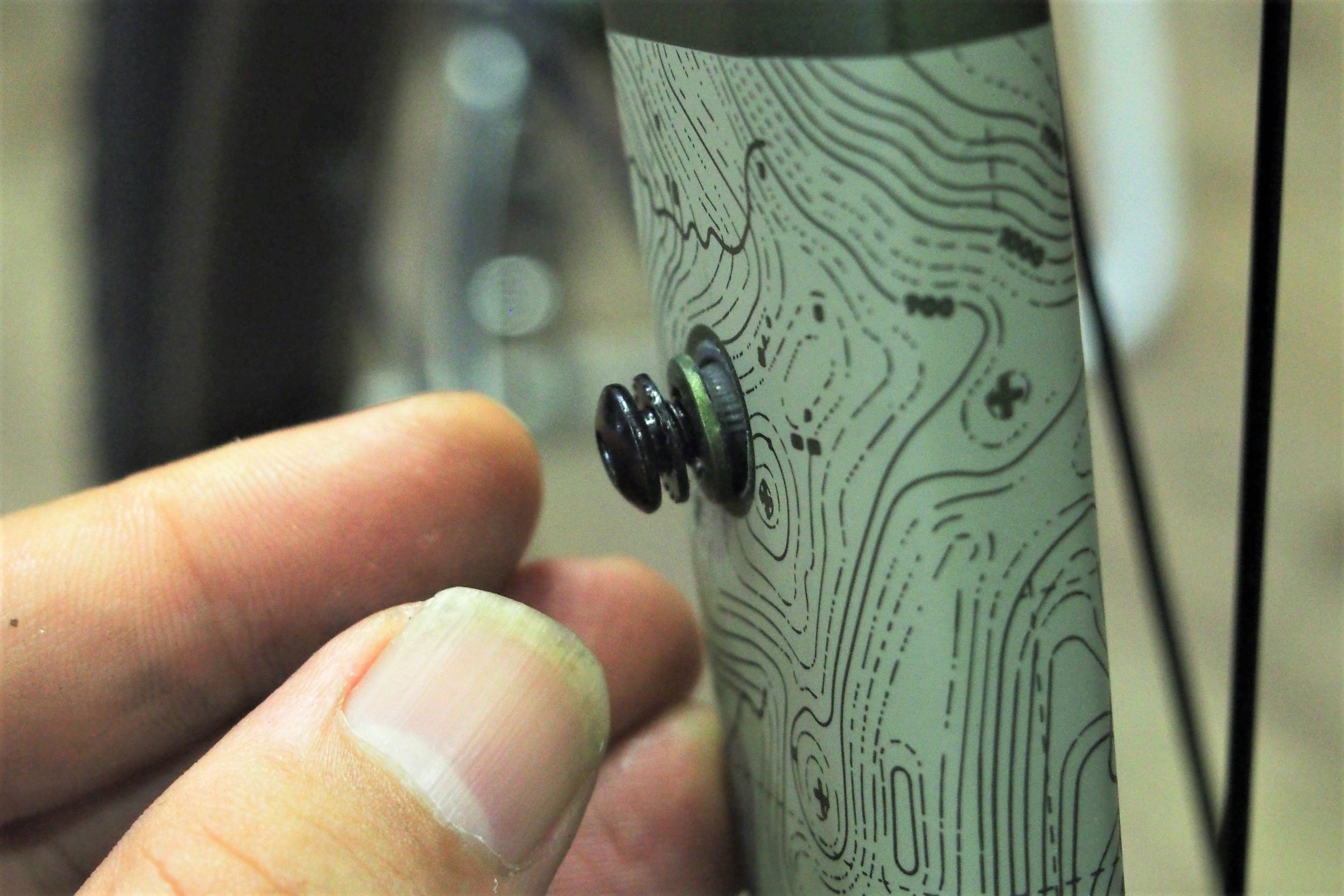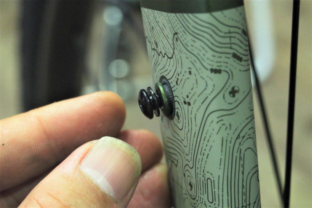 画像をみてピンと来た方はお勉強熱心な方でありましょう、この部分はJAMIS RENEGADEのカーボン製フロントフォーク部に配置された台座であります。(フロントフォーク横って所謂デッドスペースだったりするので、その位置にある台座ってキャンプツーリング時シュラフを積んだりするのにとっても便利ですね~。(例:コチラ))