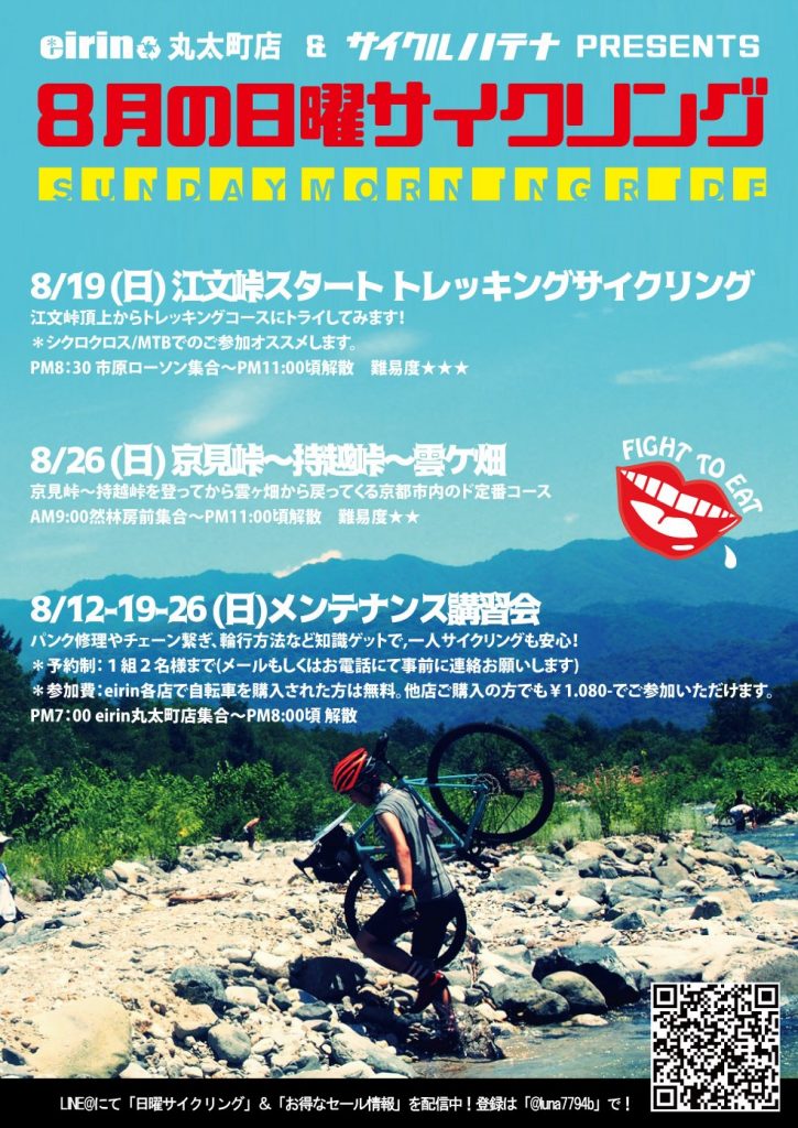★★eirin丸太町店&サイクルハテナ主催★★【日曜サイクリング & メンテナンス講習会】2018年8月の予定です!