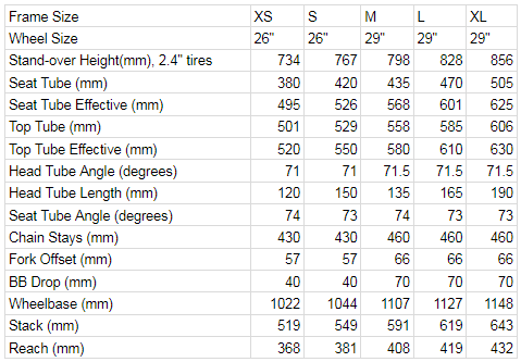 Tire: 29″ x 2.4″ or 27.5 x 3.0 (M, L, XL), 26″ x 2.4 (XS, S)