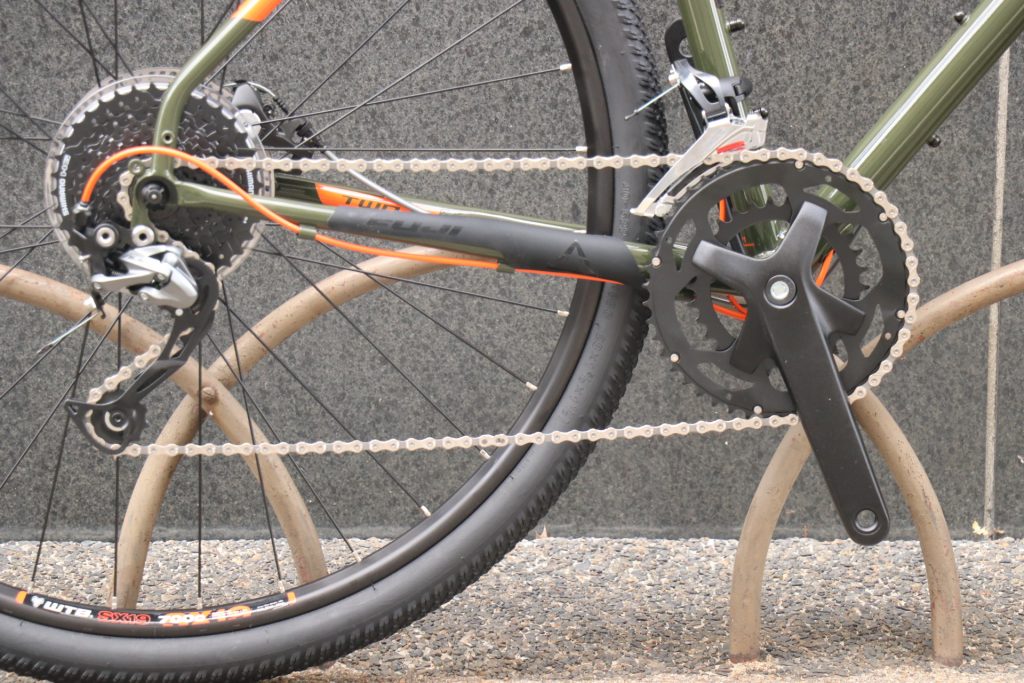 メインのコンポはSHIMANO SORA2x9speed。シフター・フロントディレイラーはSORAですが、JARI1.5と同じようにSHIMANOラインナップに無いFSAの44/28tクランクを採用。