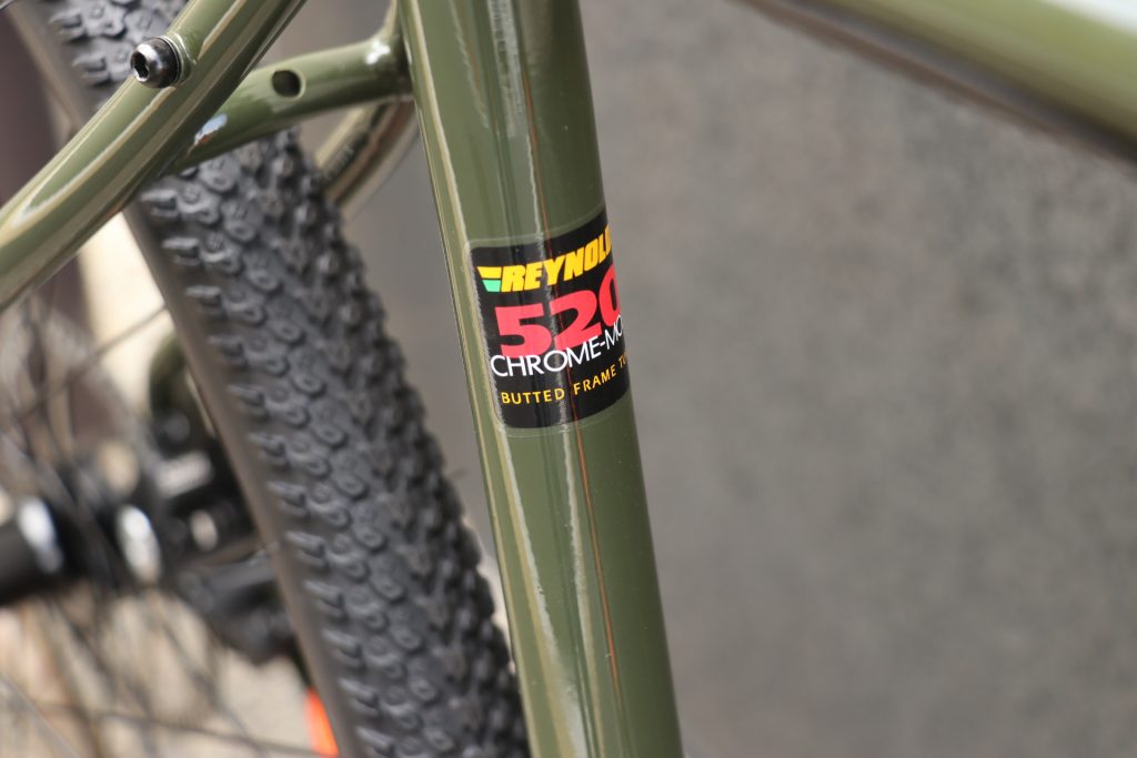 Frame: Reynolds 520 chromoly, rack & fender mounts, Triple bottle mount, Flat mount disc, top tube bento box mount