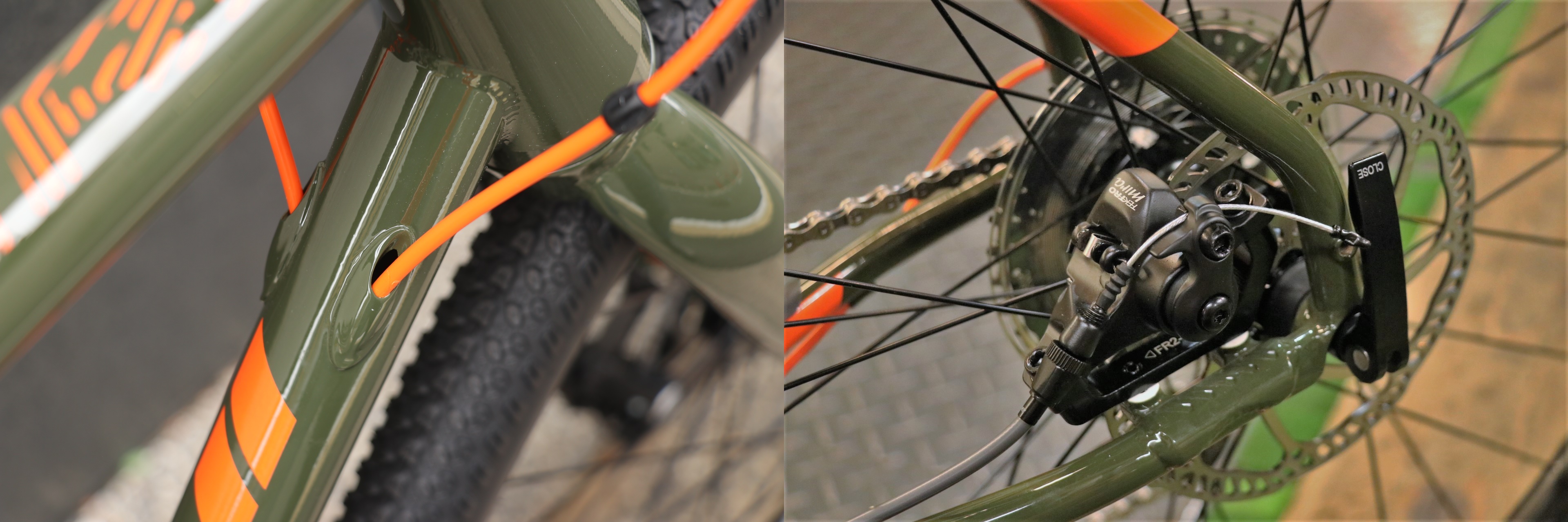この価格なら仕方ないところですが、ホイールの固定は前後ともにクイックリリースに。スルーアクスル>クイックリリースの図式になるのは避けられませんが、ディスクブレーキ・クイック対応の軽量ホイールなんかもまだまだラインナップはありますし、ヘックスで締めるスキュアーに交換すれば固定力も上げられるのでまだまだ大丈夫ですよ!
