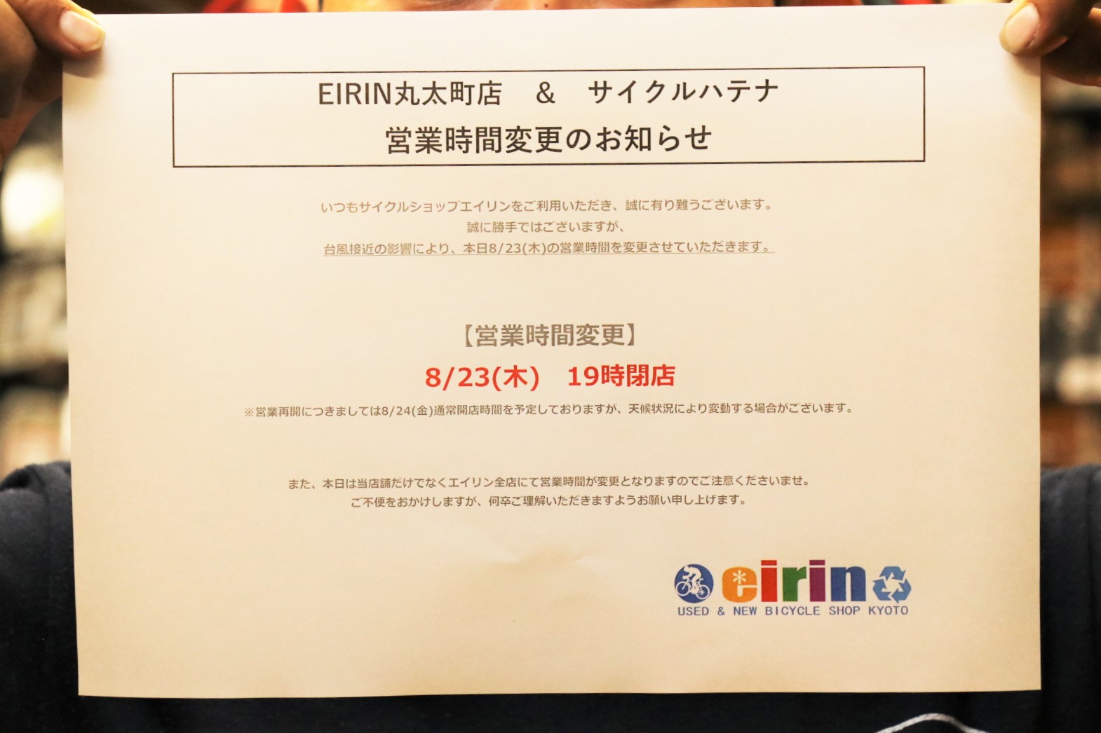 台風接近の影響により、eirin丸太町店、サイクルハテナともに本日8/23(木)の営業時間を変更させていただきます。