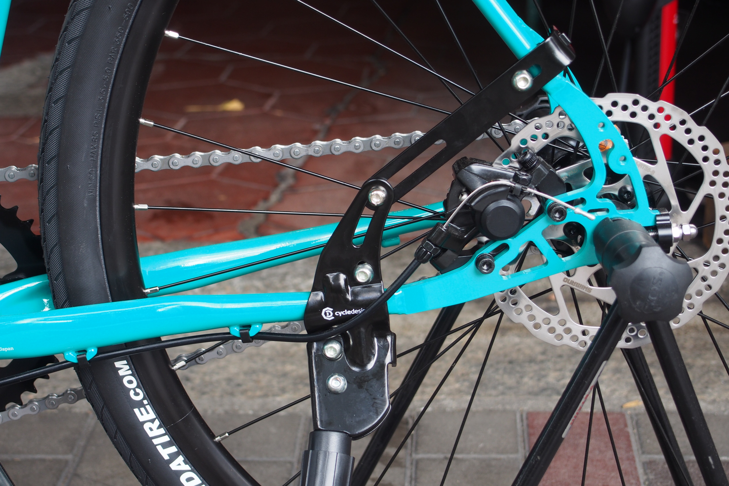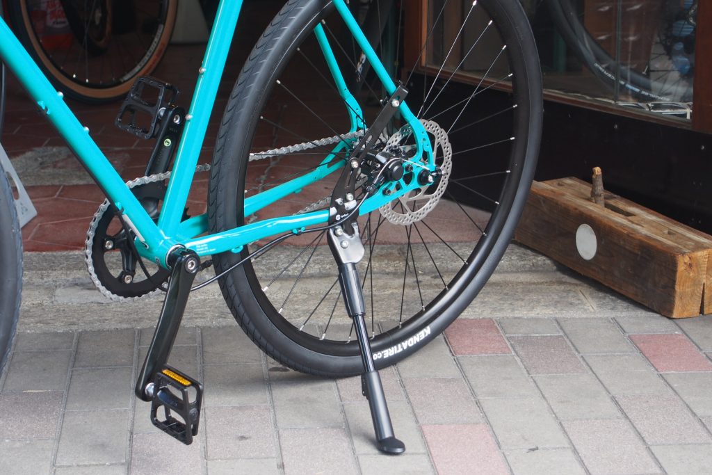 このキックスタンドはクランプ間が超ワイドなので、NS-D1のように、チェーンステー⇔シートステー間が広いフレーム形状、チェーンステー上にディスクブレーキ台座がある自転車にも無理なくOK!(因みに上画像はサイズ520です)