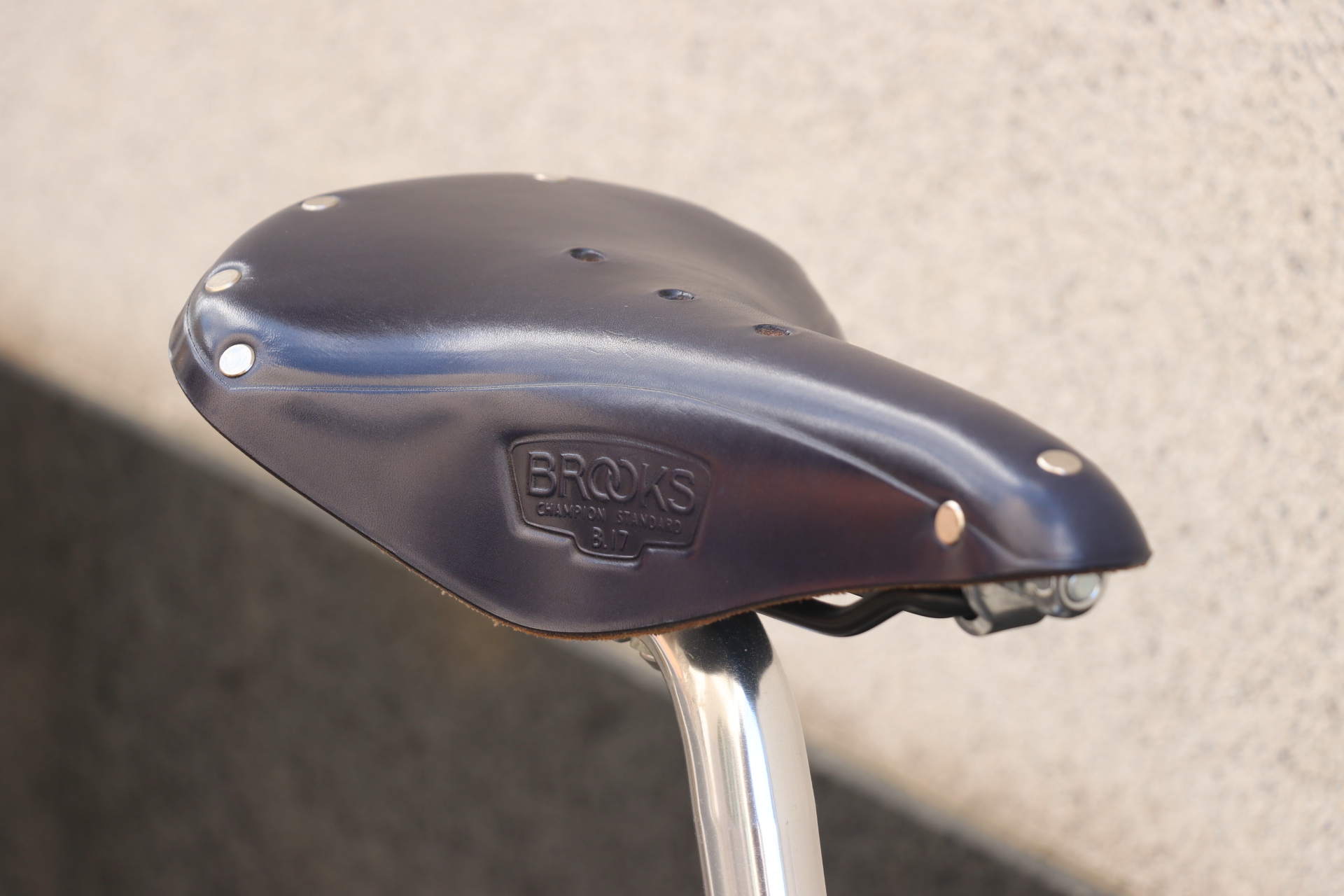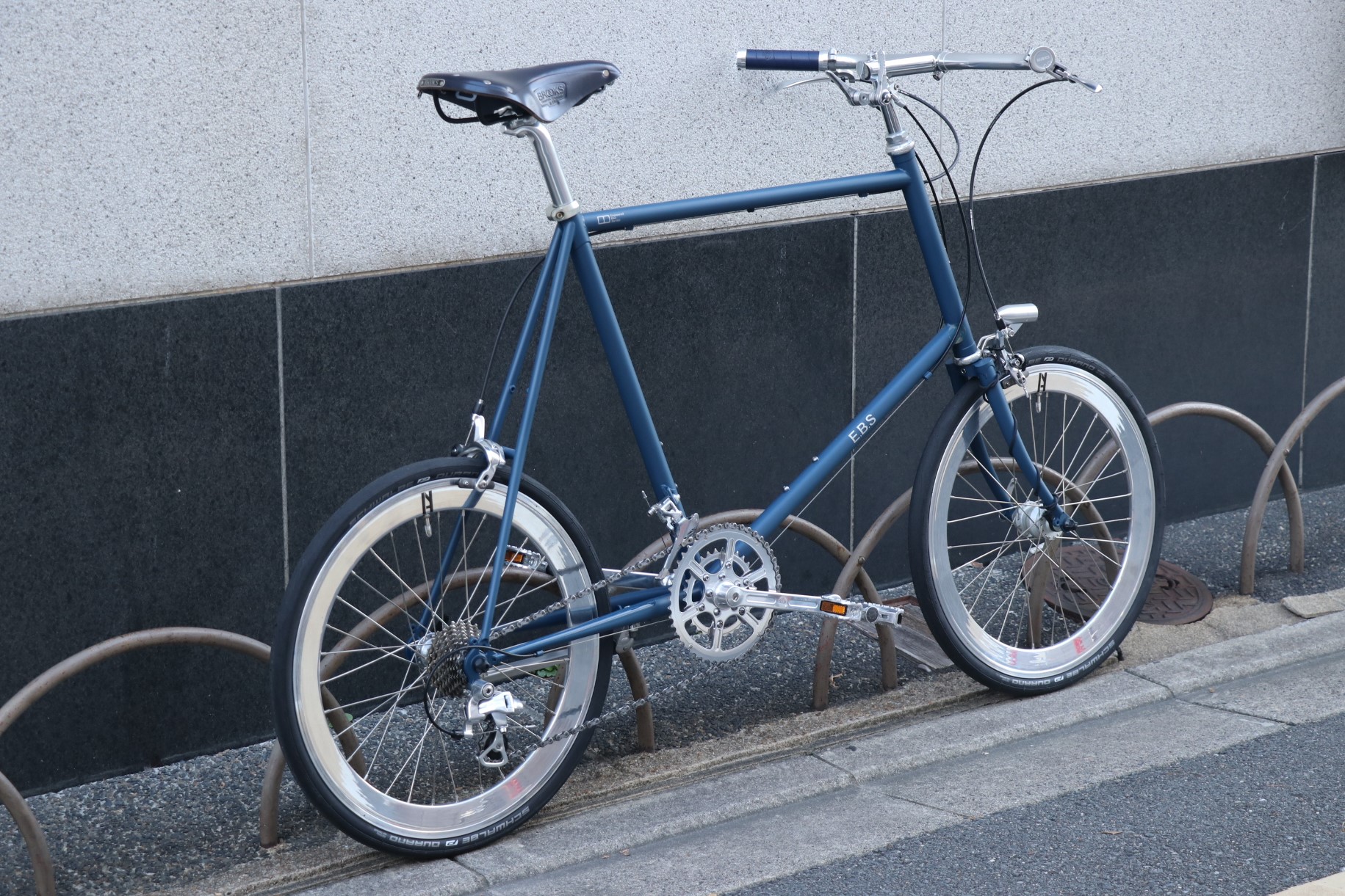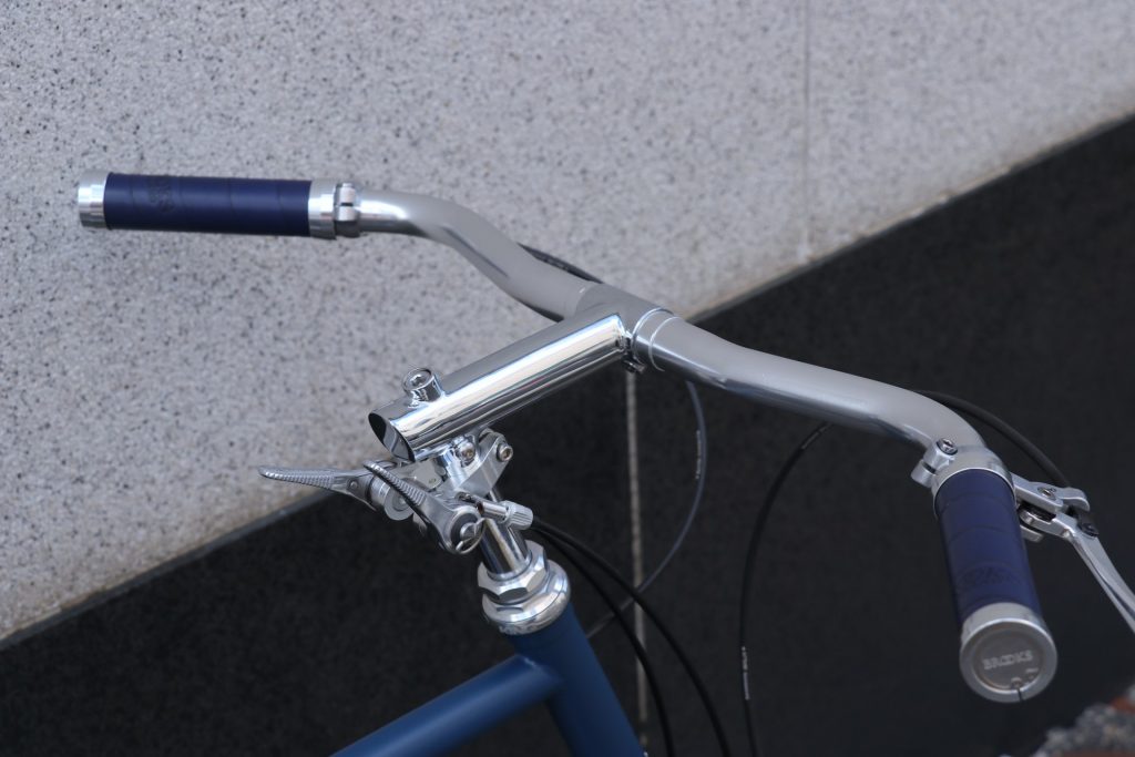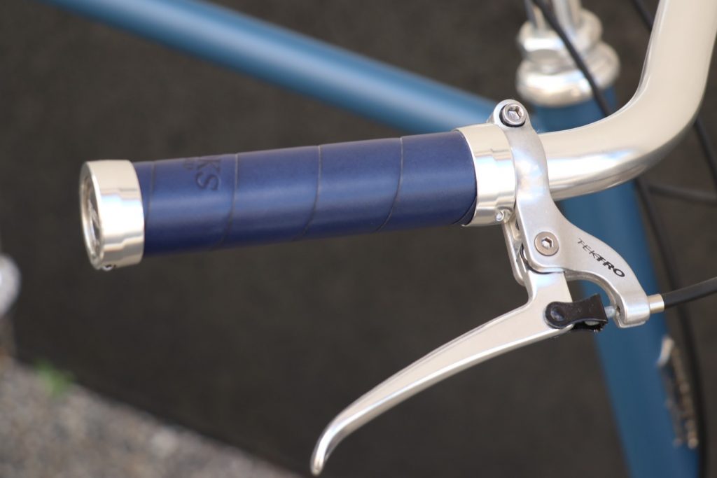 サドルとグリップはBROOKSでコーディネート。ネイビーのB17スタンダードサドルに同色のLEATHERGRIP、長く使い続けられてメンテナンスも出来る・その上カッコイイとなると文句無しですね。