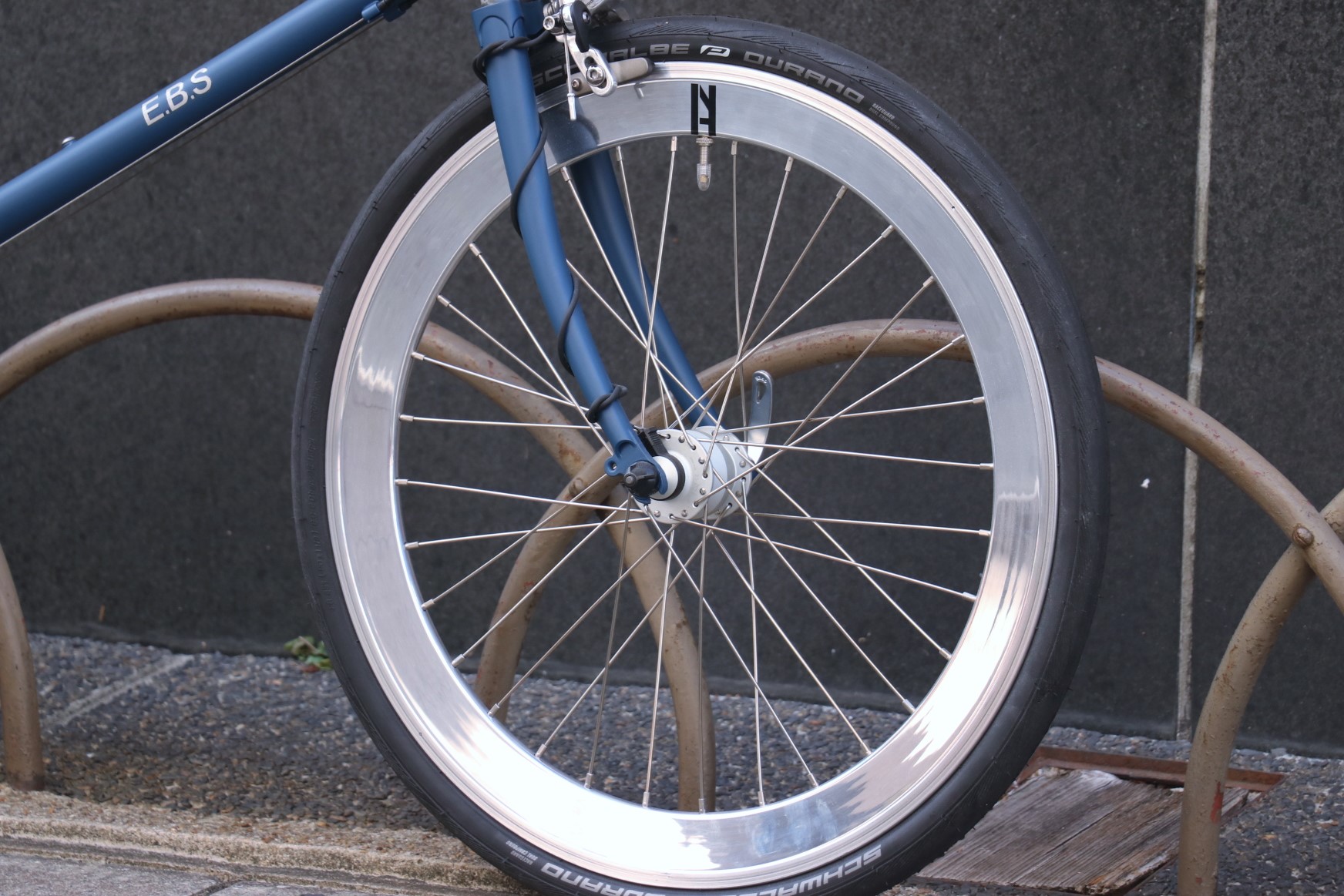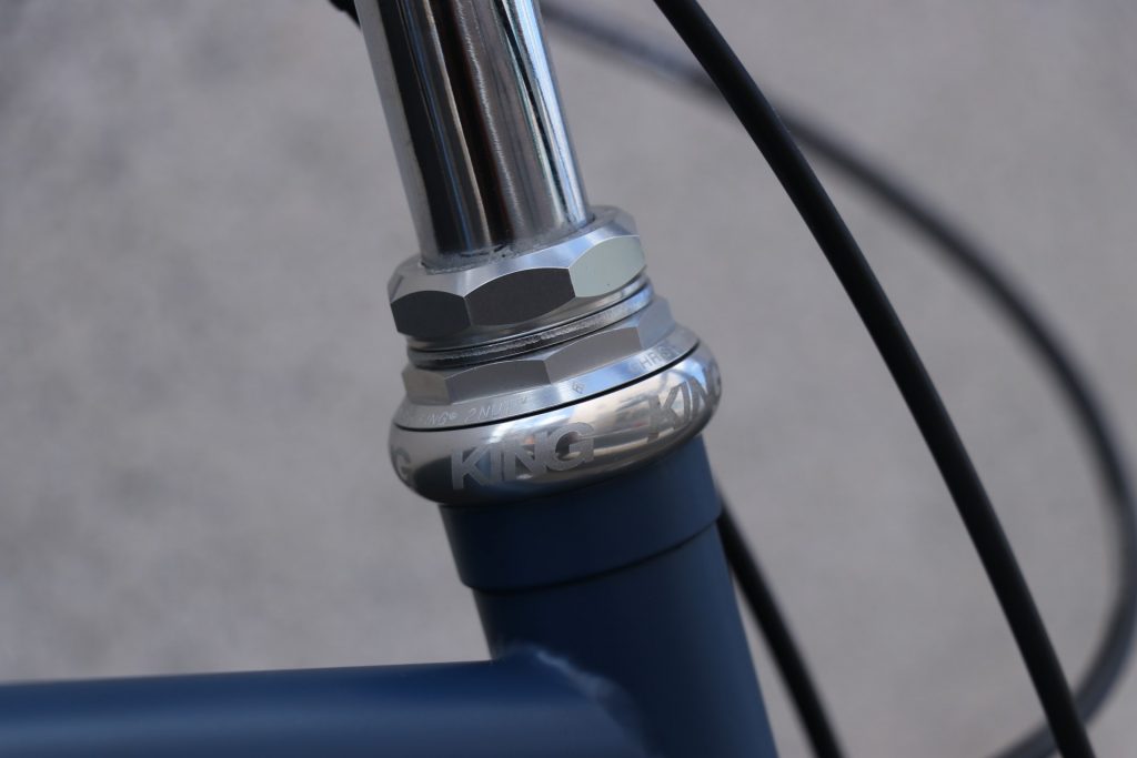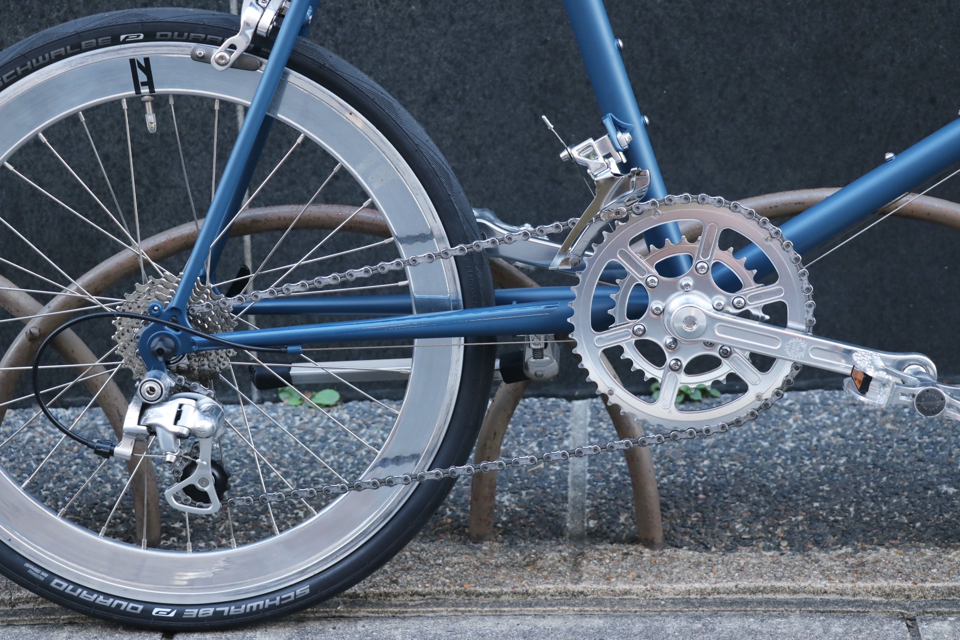 サドルとグリップはBROOKSでコーディネート。ネイビーのB17スタンダードサドルに同色のLEATHERGRIP、長く使い続けられてメンテナンスも出来る・その上カッコイイとなると文句無しですね。