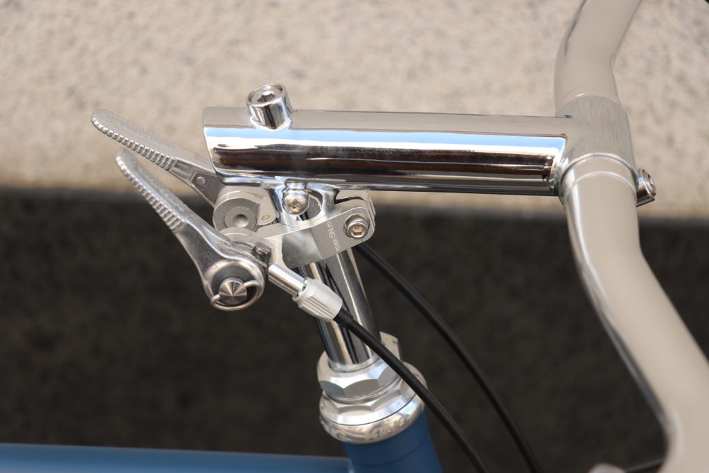 ちなみにシフターはステムにクランプ。手元に近く操作もしやすい・それでいてハンドル回りはシンプルに見えますね。