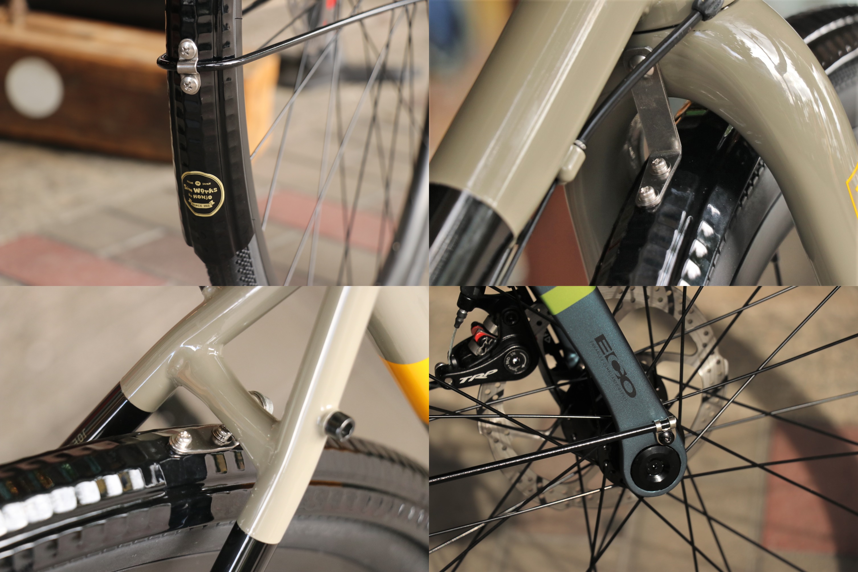 標準で36cのタイヤ幅という事もあり、タイヤクリアランスと吟味するとFlat42が最適解では?という結果ですね。クロモリフレームにゴツめのカーボンフォークを合わせたEXPATにデザイン的にもマッチ!真横から見るとフェンダーの主張がかなり抑えられるのもミソだったりしますね◎
