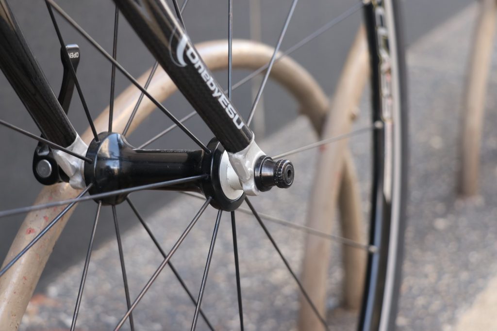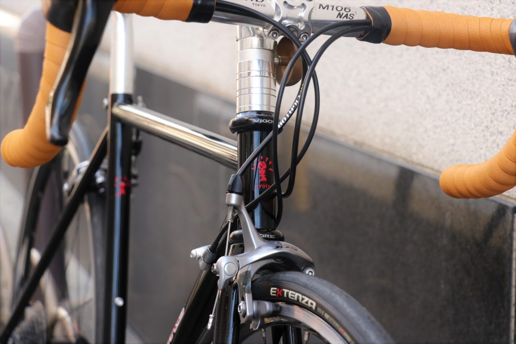 純正のクロモリフォークでは無く、ONEBYESUのカーボンフォーク(アルミコラム)に交換されています。