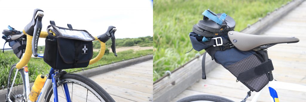 ハンドルには“Rawlow Mountain Works x PAPER SKY” BIKE’N HIKE FRONT BAG。サドルバッグはBike’n Hike Post Bag。ドローコードにはベドロックサンダルをセット。