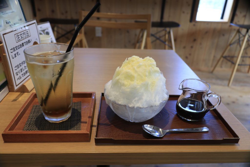 和束茶カフェさんで暑さを癒すかき氷をオーダー!お茶の産地らしくほうじ茶シロップ!甘さと香ばしい苦さが最高でした。ちなみにドリンクの方は茎ほうじ茶のソーダなる物でこちらも美味!