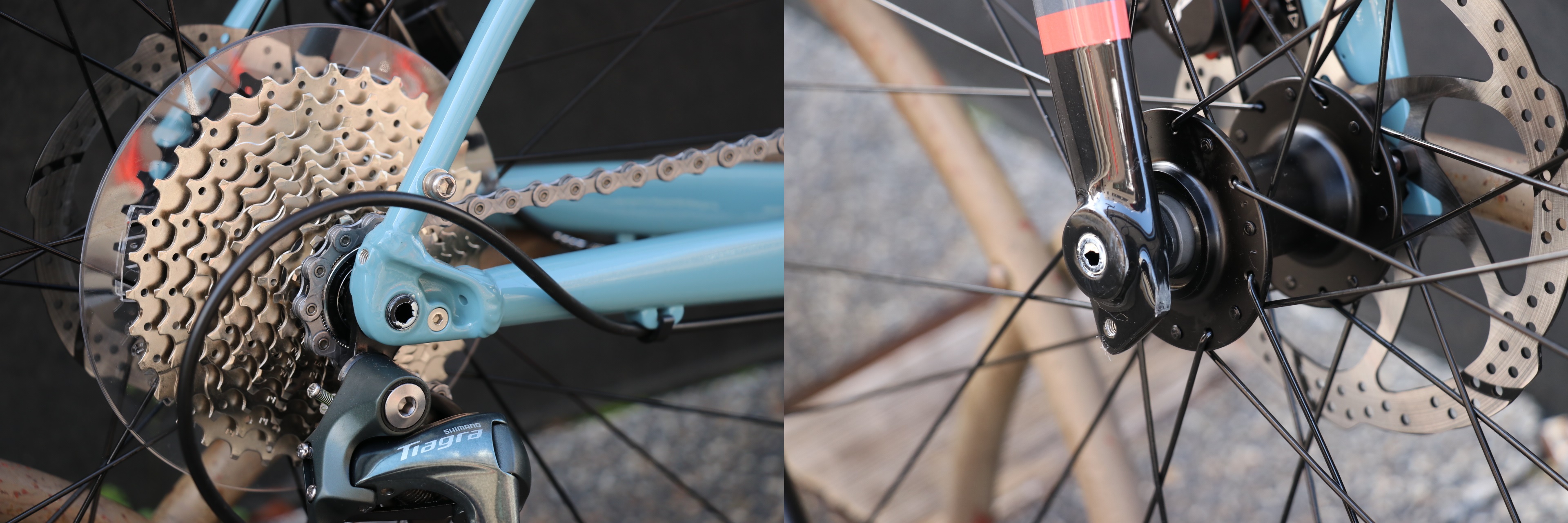 ホイールは前後共に12mmスルーアクスル。ディスクブレーキの高い制動力をしっかりと受け止めてくれるだけで無くホイールの横へのよじれ・たわみを抑えてくれるのでガッツリ荷物を積んだツーリングでも安心できますよ!
