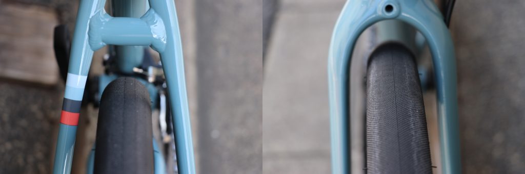 標準タイヤ700x40cを装備してのこのタイヤクリアランス。MAXで700×45cの装着を可能とし、27.5=650bにサイズダウンすれば2.1インチ≒53mmまで使用可能な正にアドベンチャーバイクなのがNEWモデル『BROAM』。700の走行性能も魅力的ですし、27.5=650bの安定感と転がりの軽さ、どちらも楽しめるのはイイですね◎(27.5=650Bについて詳しくは下記ブログもチェックしてみて下さい!!)