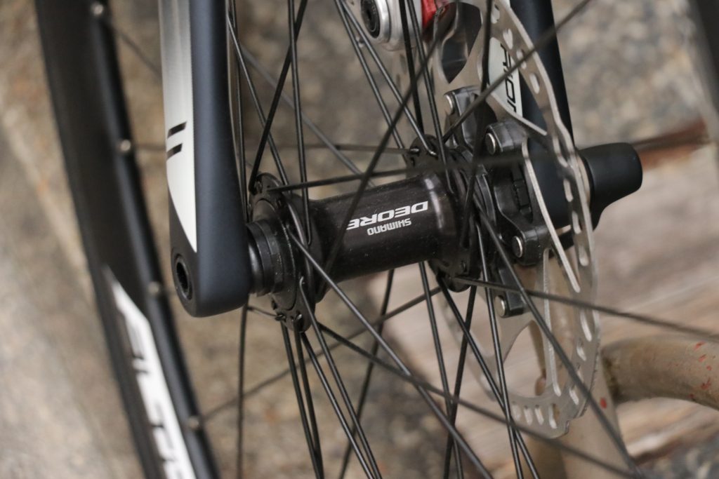 そして、ディスクロードのもう一つの魅力がこのスルーアクスル!フロントホイールを固定する15mmの貫通シャフトによる剛性面の向上はかなりの効果があります。