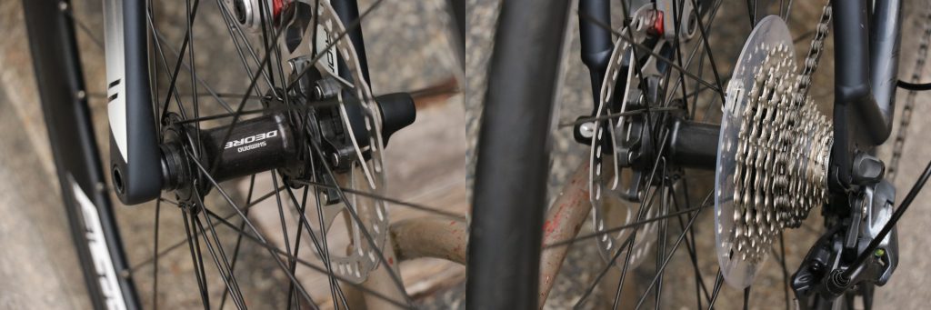 太いシャフトはディスクブレーキのストッピングパワーを支えるのと同時に、ライダーのもがきにより発生する回転軸のねじれを抑え、そのパワーを推進力におきかえる役割を果たしてくれます。(事実、プロのレースシーンでもディスクロードが増えつつあるのはこの剛性アップも大きな要因のようですよ)