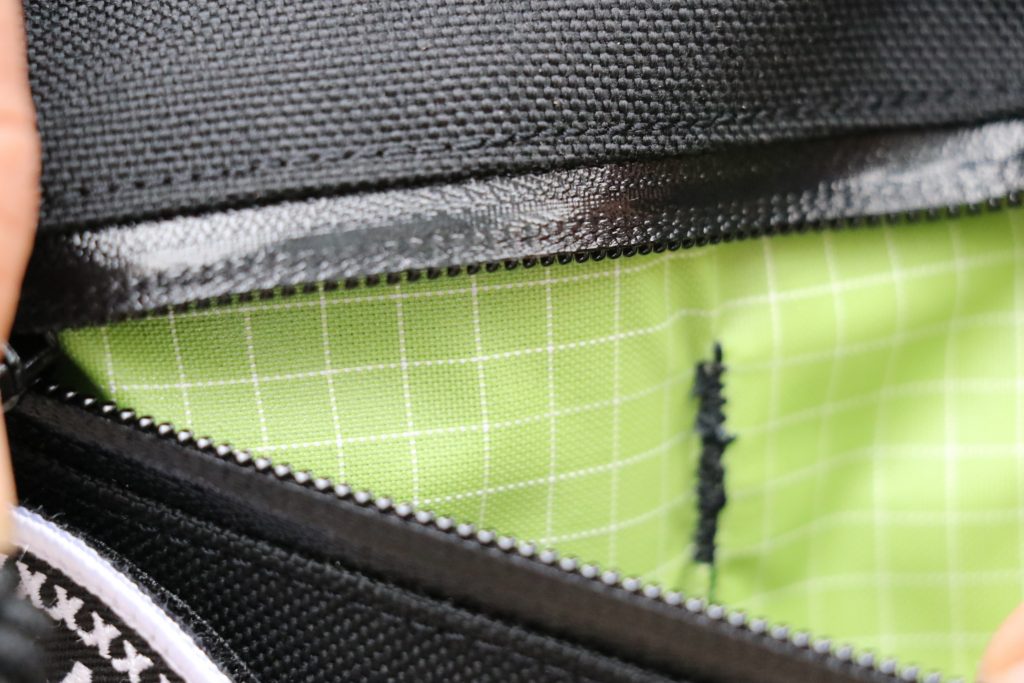 メインは厚手のコーデュラナイロンでタフに使えて、各ジッパーは止水処理済、メインの収納部分の内側はコーティングされたナイロンが裏張りされているので防水性もそれなりに期待できそうですね!