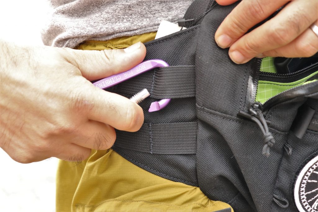 ウエストベルトの両脇にはベルトループが付属。SWIFTやその他のブランドからも出ているステムバッグをマウントしたり、カラビナやキーチェーンを引っ掛けたりにも使えそうですね。