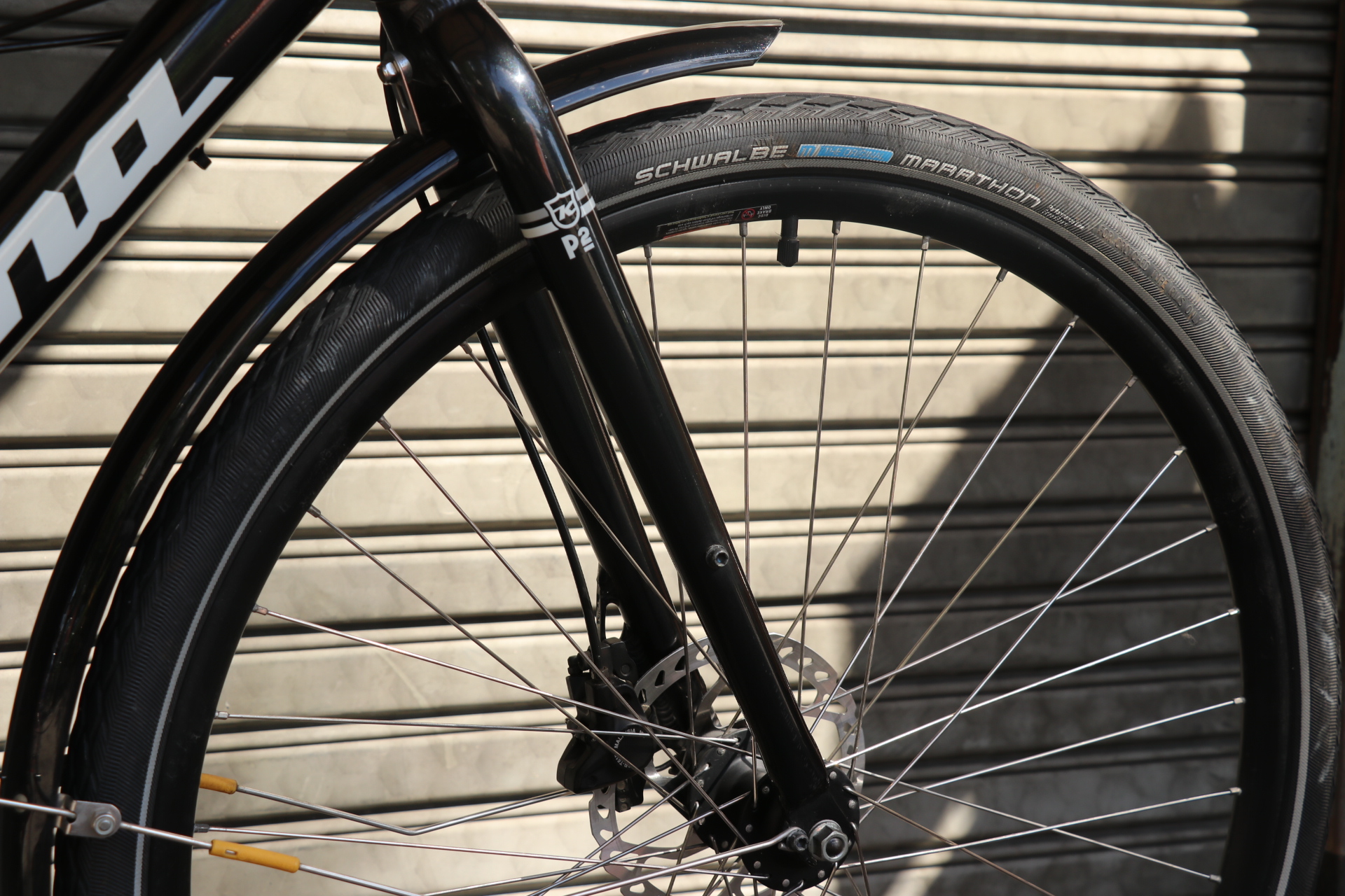 タイヤは以前のオーナーさんのカスタムでSchwalbeマラソンにカスタム済。毎日ハードに使う方が多いロングテールとは間違いなく相性良いですね。パンクトラブルも少なく・耐久力も申し分無い良いタイヤです。