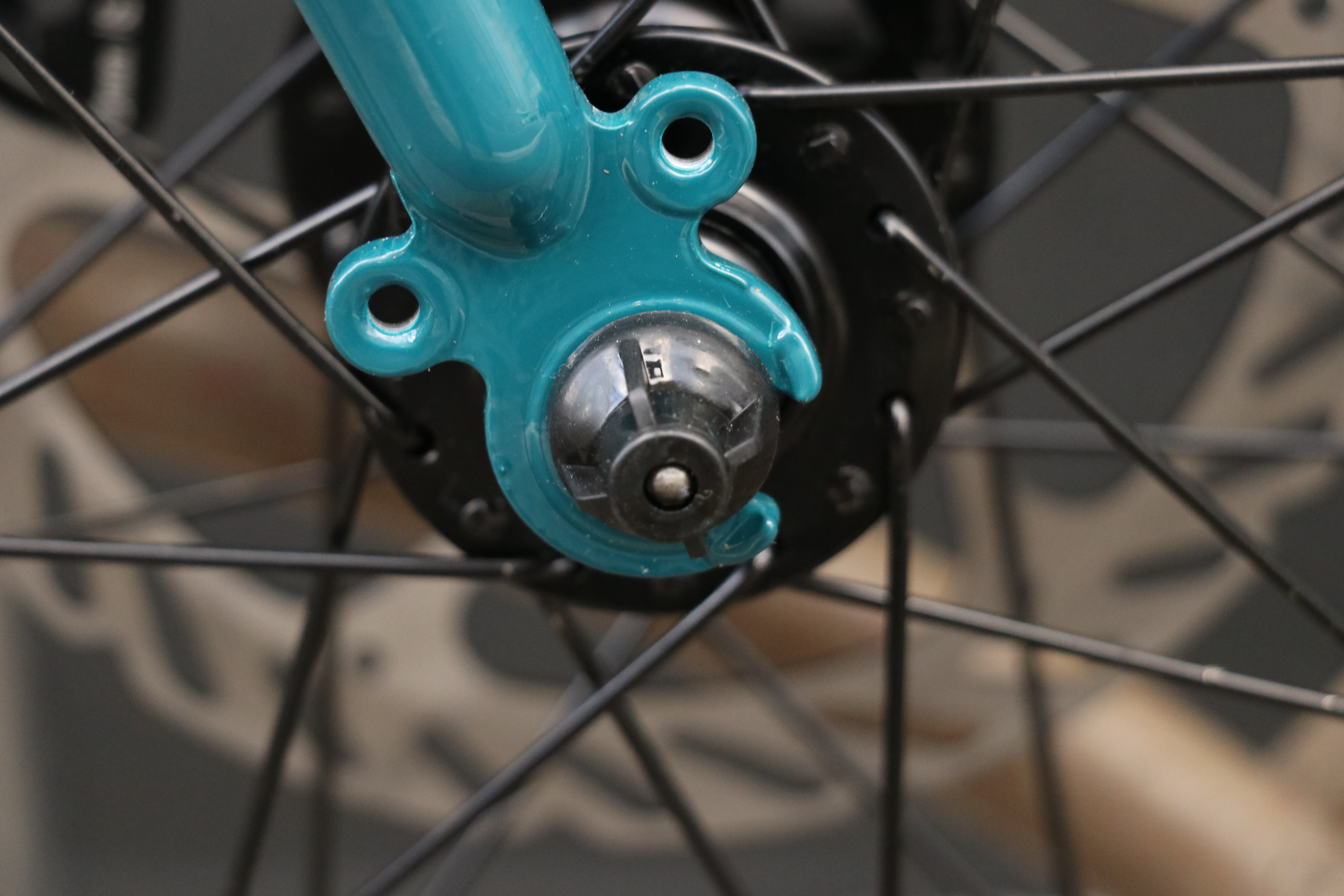 因みにですが、フロントフォークのエンドはディスクブレーキの制動力を受け止めつつ、万が一クイックが弛んでもホイールが急に外れてしまわない様、前開き仕様となっているので、クイックレリーズでも充分安心です。