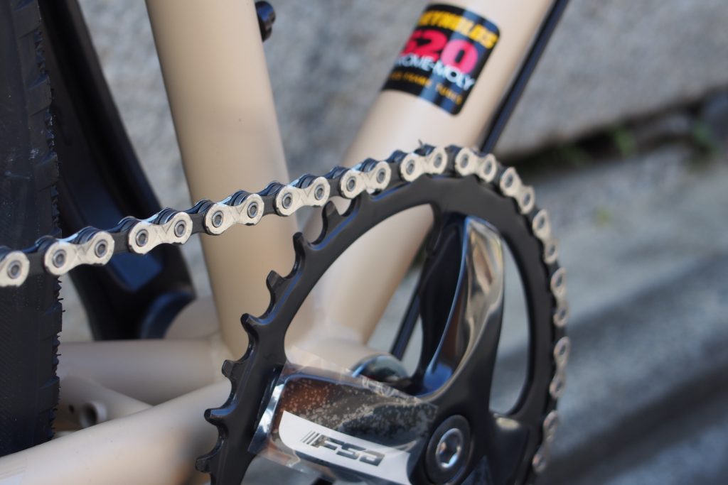 因みにフロントチェーンリングはダートコースでチェーンが暴れても外れにくい歯先の長いナローワイド仕様。