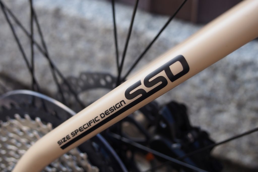 実はJAMISを語る上に置いて非常に大事なポイントとなる「SSDシステム」。同じ径・バテッド位置のパイプを全てのサイズに採用するほうが、コスト削減に繋がりますが、フレームサイズごとにトップチューブ、ダウンチューブの径を変化させ、BBハイト、リアセンター、フォークオフセットに至るまで変化をさせており、設計者がねらった通りの乗り心地がどのサイズでも得られるというもの。