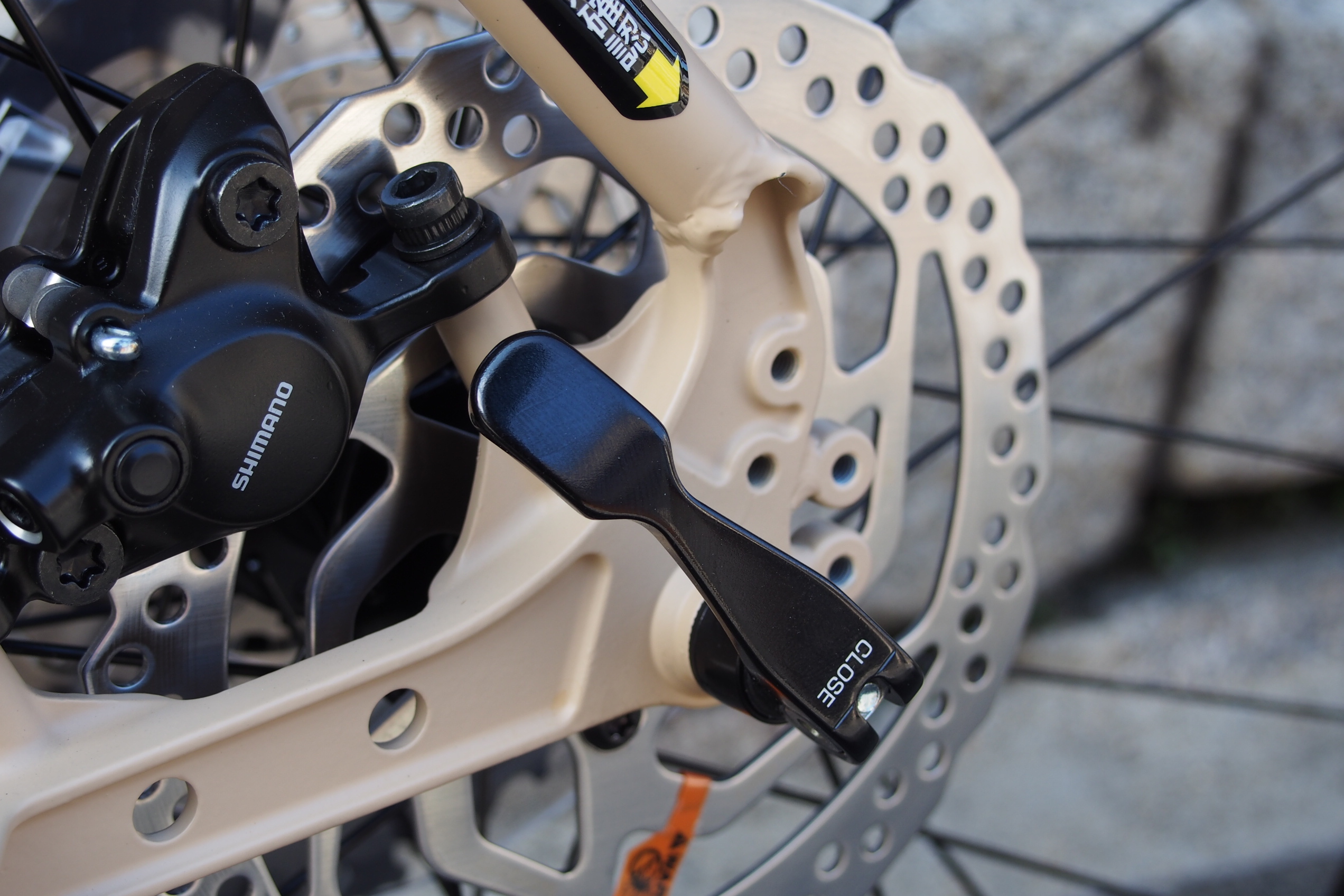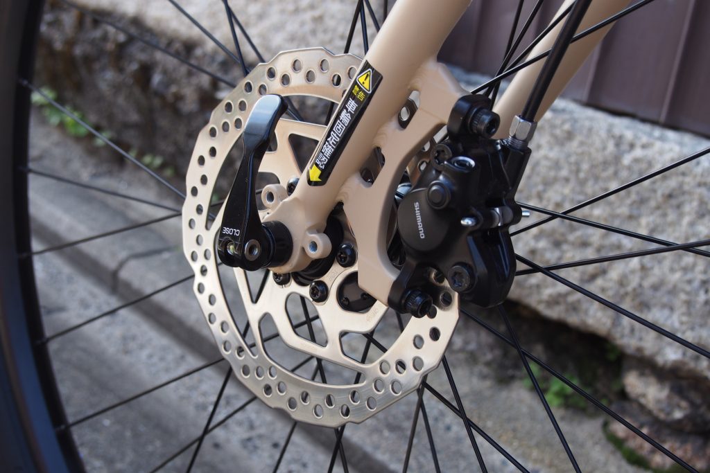 本モデルには油圧ディスクブレーキが採用。雨天時にも滑り難く高い制動力を持つのは勿論、じわっと効かすスピードコントロール性も高くあります。レバー、キャリパー、ローターともに全て安心感あるシマノ製が採用。