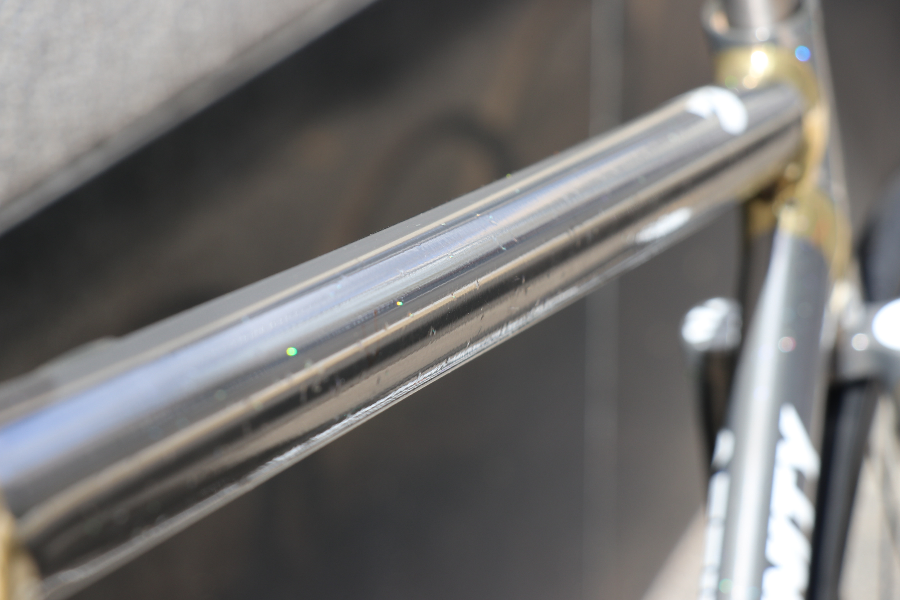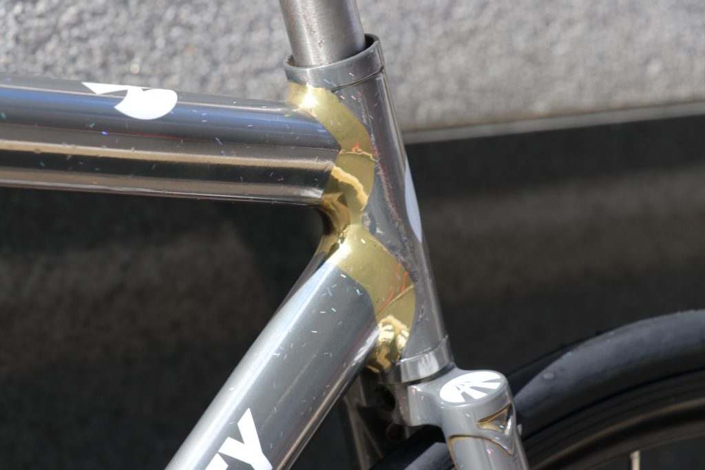 ペイントは溶接痕を見せる為にクリアーのみ、そこにアクセントとして競輪スタイルのラメを散りばめておりますよー