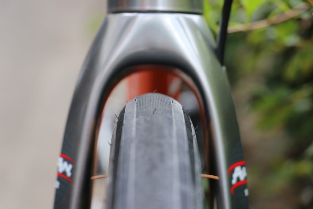 本フレームの最大タイヤクリアランスは、700X42 or 650b x50。因みに今回は38Cを用意。「ピーナッツ・バター」カラーのサイドウォールは、林道走行などでたまに起こりうる”サイドカットパンク”などにも心強い高い耐久性をもちます。