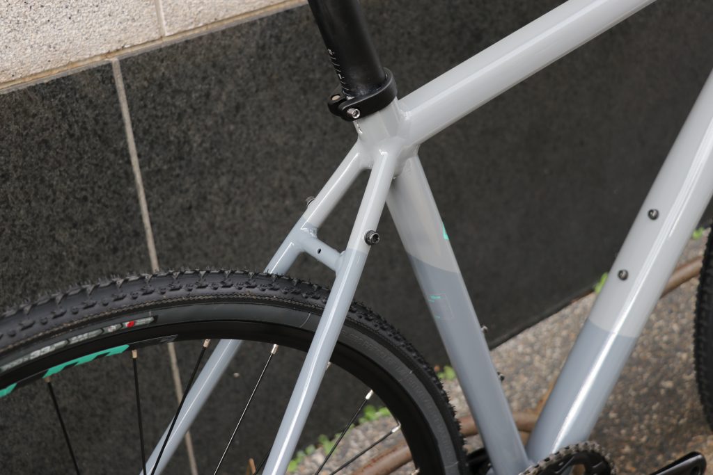 シンプルなデザインながらダウンチューブはしっかり大径チューブにする事で剛性アップ。テーパーヘッドによる剛性もディスクブレーキとは相性良く・コーナリングでのたわみも抑えてくれます。