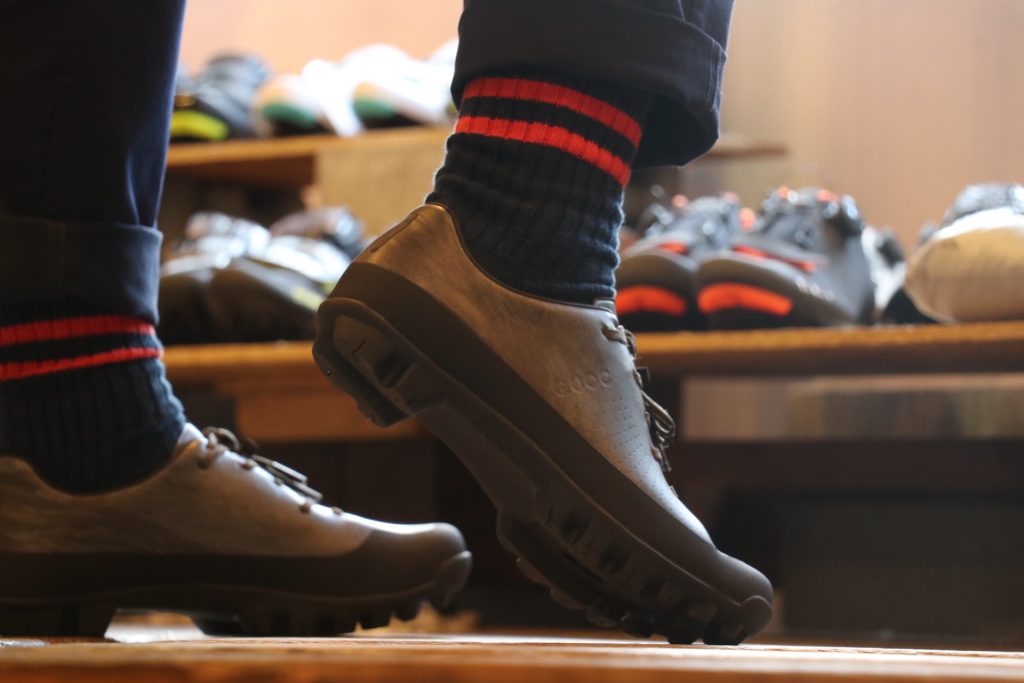 グラベルライドをしたことある方ならご理解いただけるかと思いますが、通常のレーシーなSPDビンディングシューズだとソールが硬すぎて、濡れた岩や木の上などで滑ってしまう事もしばしば。