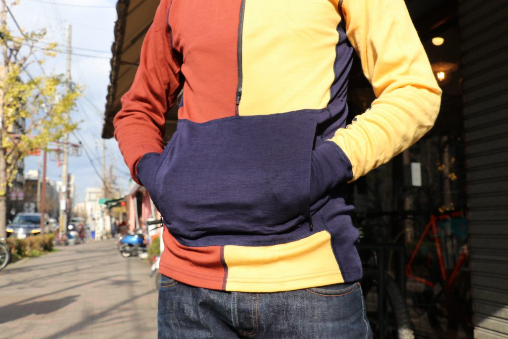 腹部には左右のつながったカンガルーポケットもちゃんと付属、ちなみに今回のジップ付きモデルはカンガルーポケットもジッパー付きに。ジッパー無しでもハンドウォーマーとしては便利ですがジッパー付きになる事で収納部分としても安心して使えますね◎