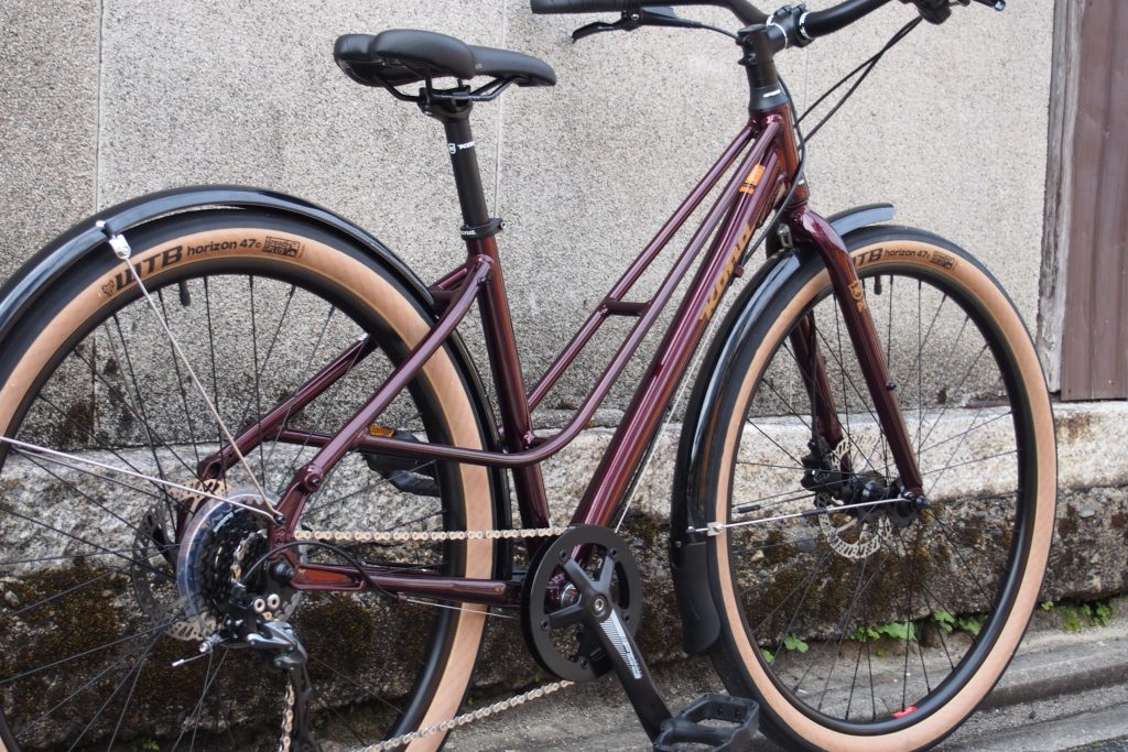 転がりは充分に軽くとも、路面からの衝撃によるパンクを減らし、かつスリップにも強い、昨今ツーリングバイク~グラベルロードの分野から最も注目されるこの「650Bx47Cロードプラスタイヤ規格」が、本モデルにはいち早く落とし込まれております。