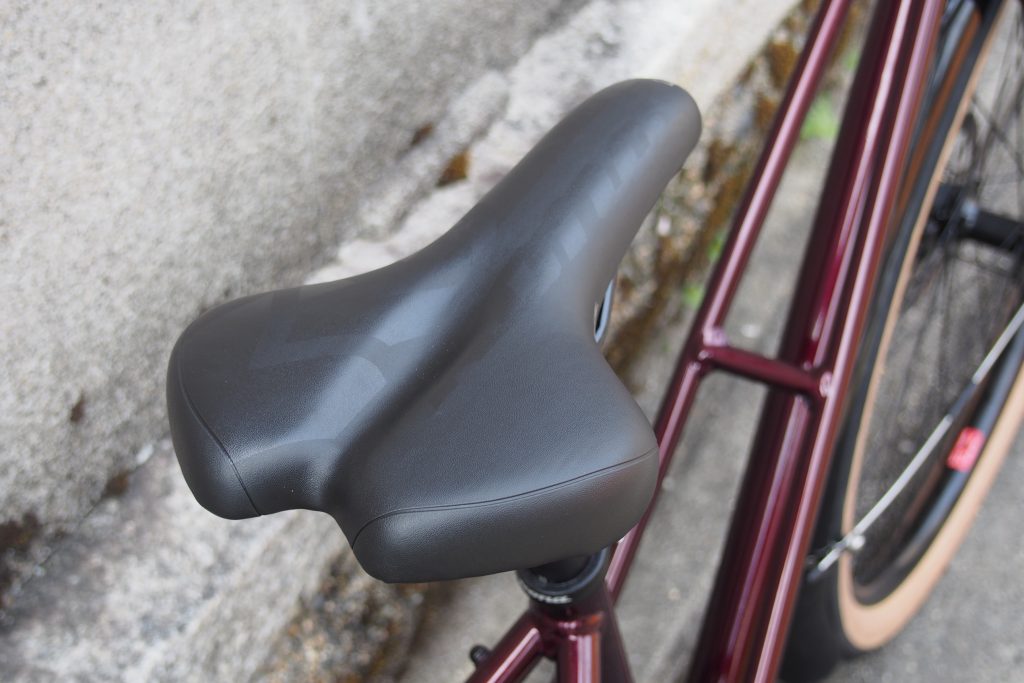 お尻に負担出にくいよう座面はしっかり広めながらもペダリング時に股擦れしにくいよう、前方に向かってえぐれたフォルムのサドル。