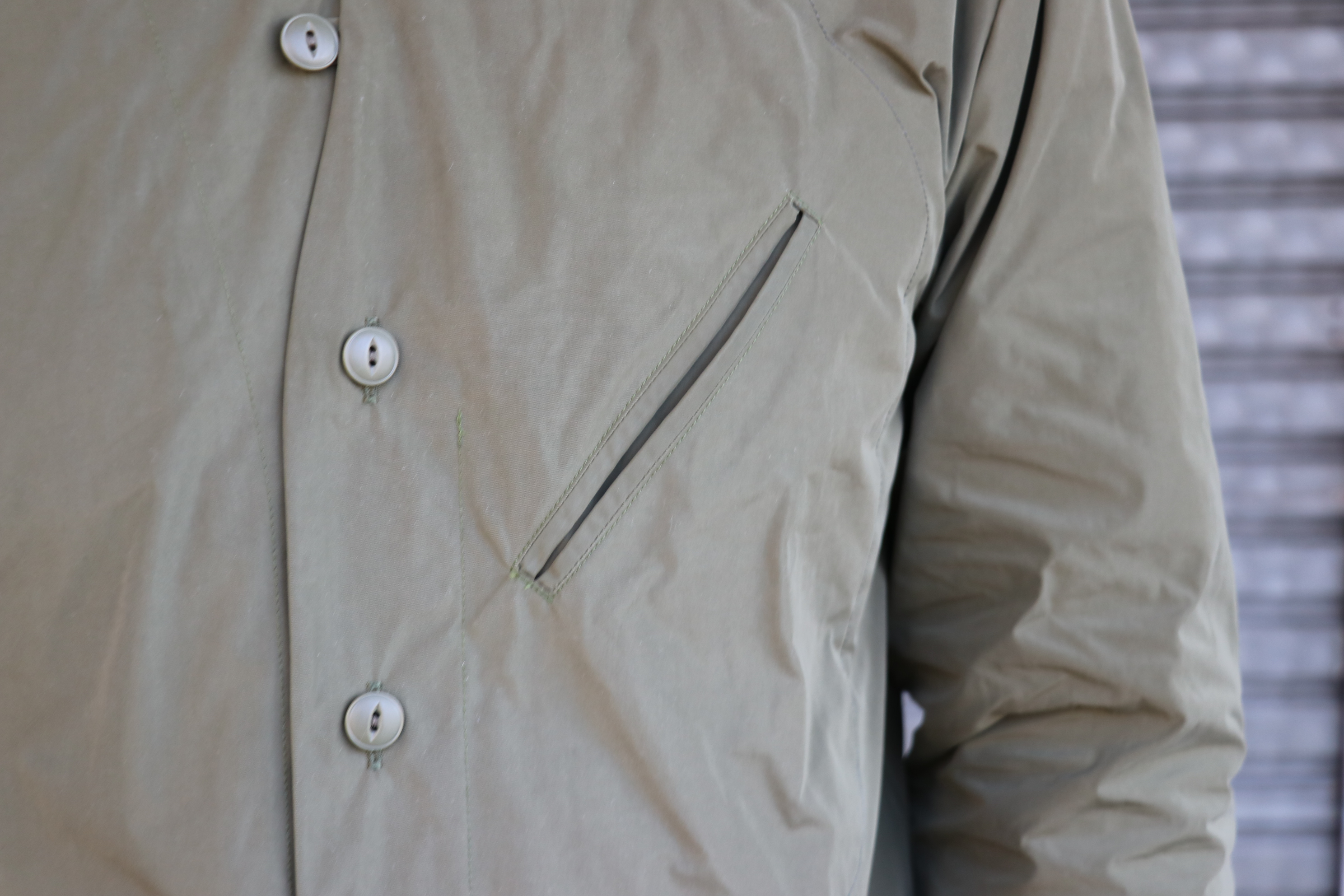 ぱっと見シンプルなシャツながらも、絶妙にアールの利いた前たてのライン~襟の形、ポケットの配置に個性が光ります。