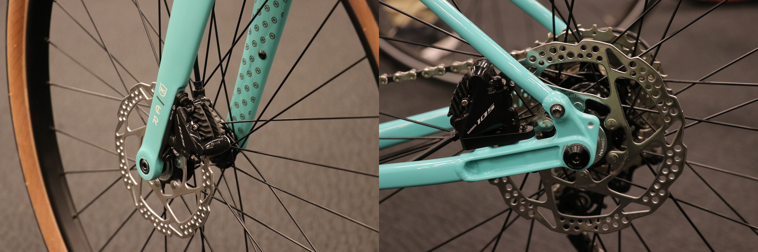 ディスクブレーキや、その高いストッピングパワーを支える前後スルーアクスル、軽量アルミフレームにフルカーボンフォークを採用といった、